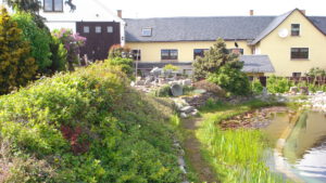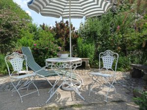 Der romantischer Garten mit Rosenvielfalt, phantasievollen Sitzgelegenheiten, Schwimmteich und nostalgischer Dekoration lädt zum Entspannen und Träumen ein.