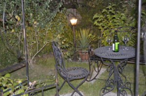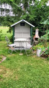 Der Garten lädt dazu ein, sich hinzusetzen und die ruhige, verträumte Shabby-Chic-Stimmung zu genießen.